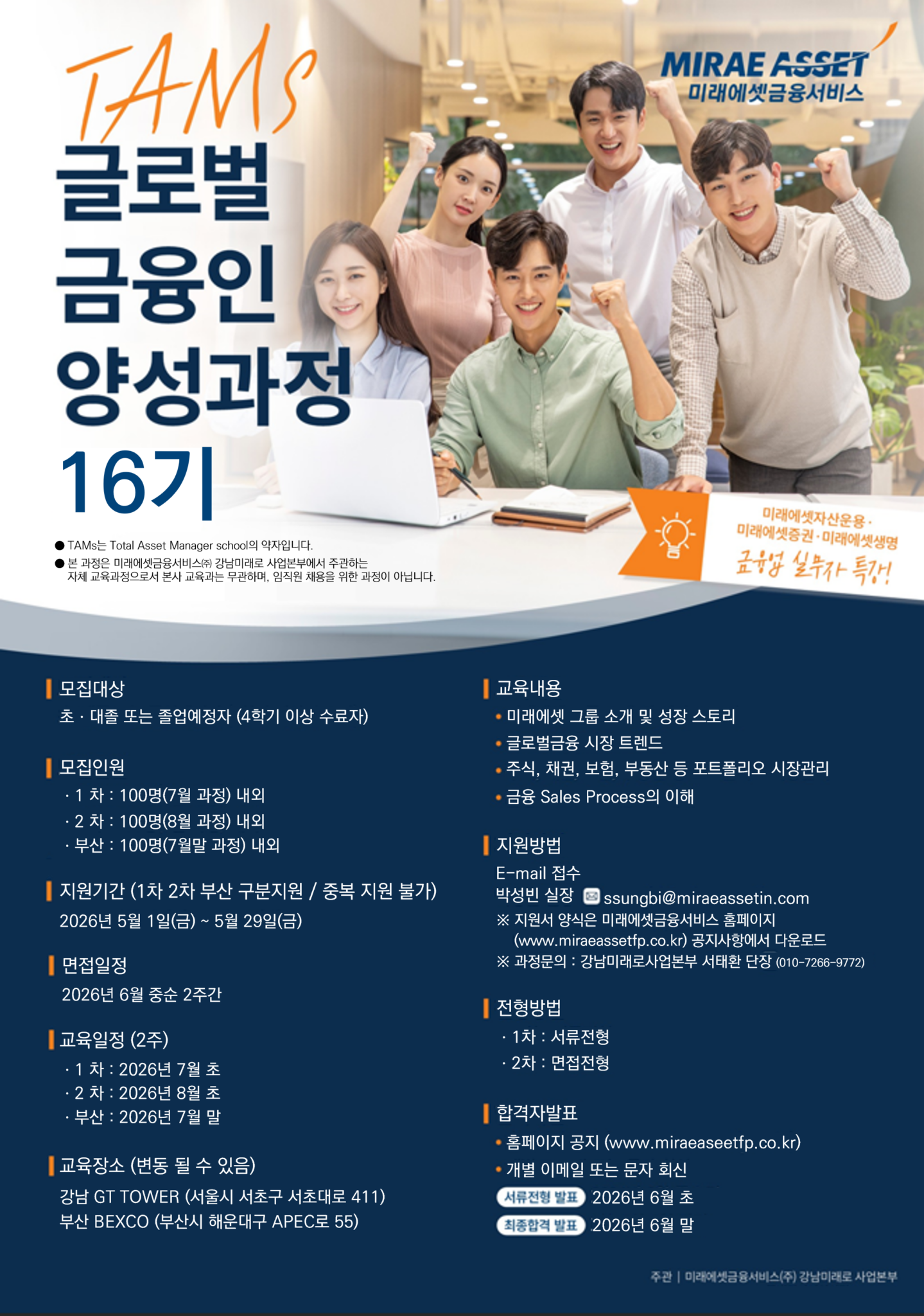 TAMS에 지원하는 여러분에게 TAMS가 단순히 이력서에 한 줄 채워 넣기 위한 용도로 활용되지 않았으면 좋겠습니다. 금융권 취업을 준비하시는 분들 뿐만 아니라, 우리 모두에게 살아가면서 필수불가결한 정보를 얻어갈 수 있을 것이라고 자부합니다. 교육 기간 동안 스펀지처럼 모든 교육 내용 다 흡수하시기를 바라요!